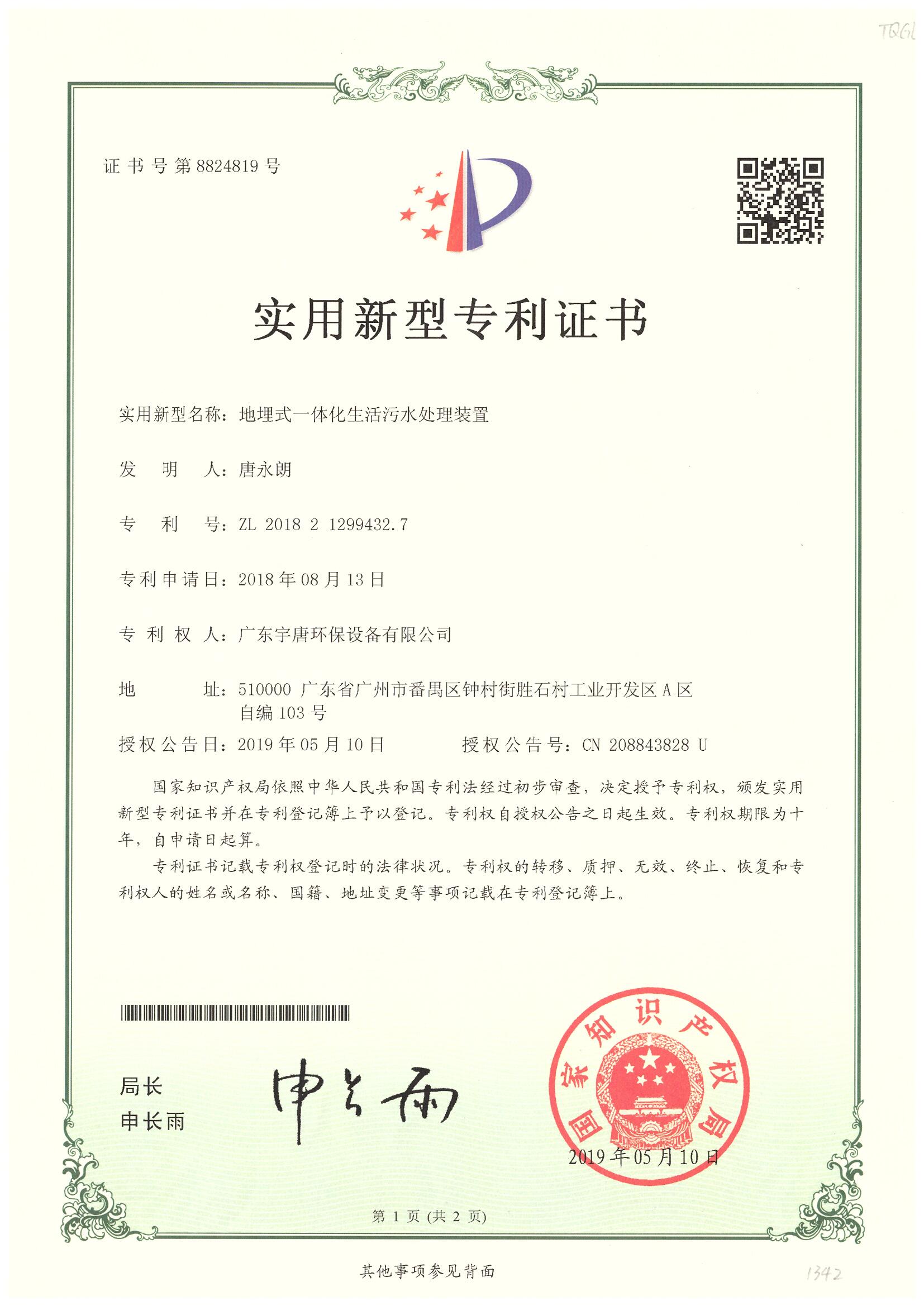 地埋式一體化生活污水處理裝置實用新型專利證書